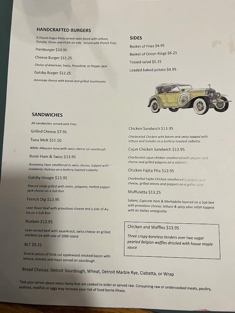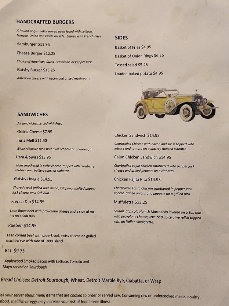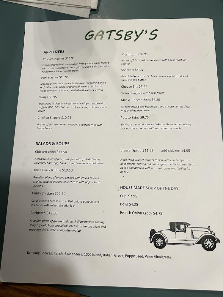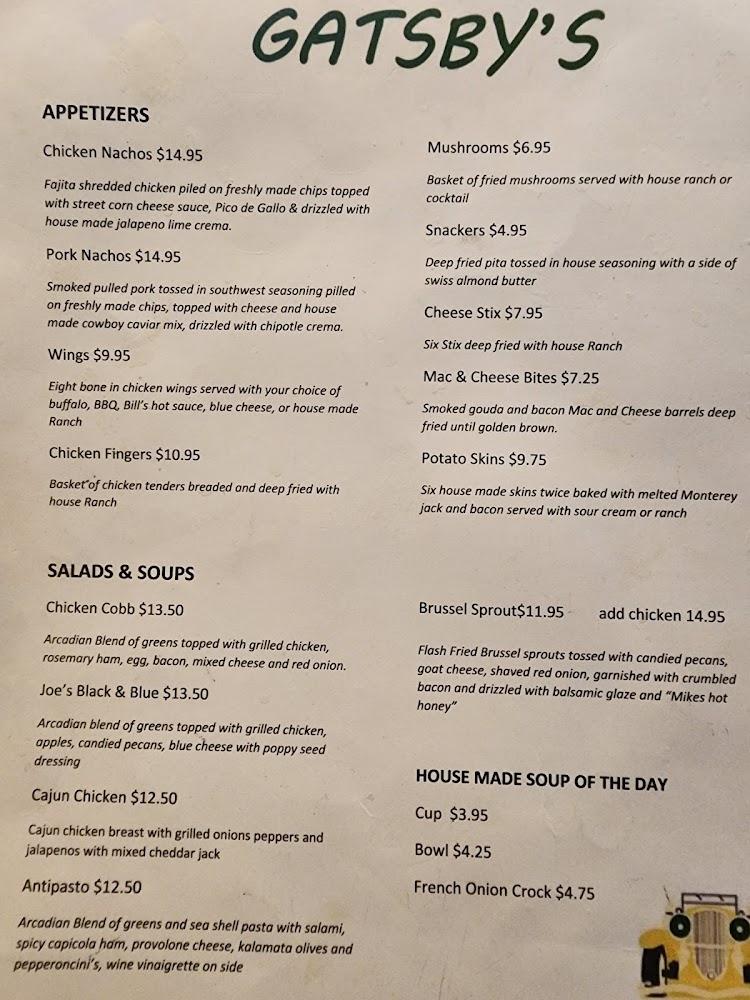 The menu at Gatsby's features a casual blend of American favorites, focusing on quality ingredients. Start with delicious appetizers like chicken nachos or wings. For mains, handcrafted burgers and diverse sandwiches stand out. The Gatsby burger is a must-try. Hearty plates, such as the fish and chips, showcase their traditional cooking style. Salads and soups are fresh and flavorful, offering lighter options. Unique sides like sweet potato fries or onion rings complement any meal. Desserts are simple but satisfying, perfect for ending your meal on a high note. With prices ranging from $10 to $20, Gatsby's caters to various budgets. The menu changes slightly with seasonal offerings, keeping customers excited during visits.